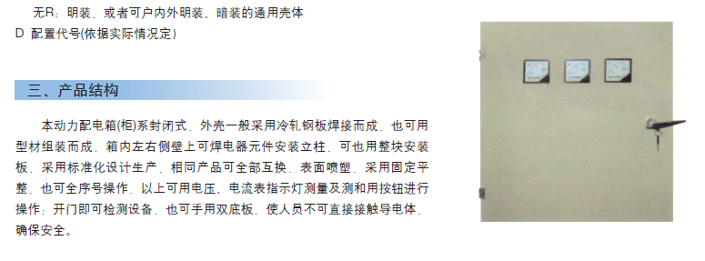 本產(chǎn)品采用了國(guó)際IEC標(biāo)準(zhǔn)和國(guó)家標(biāo)準(zhǔn)設(shè)計(jì)制造的新型動(dòng)力配電箱,此產(chǎn)品選用國(guó)外電器元件,或國(guó)內(nèi)生產(chǎn)比較先進(jìn)的電器元件。