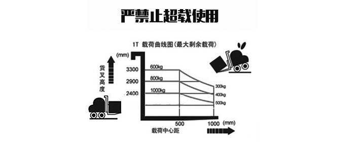 注意:寬支腿型半電動堆高車,須按照堆高車的載荷曲線圖鎖允許的剩余載荷進行操作(如下圖),嚴禁超載使用,確保安全.