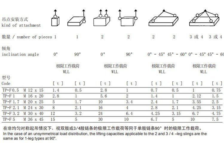 ▲TP-F型旋轉吊點標注承載能力為傾角90°時的工作載荷,可180°擺動,360°旋轉,承重狀態下亦可轉動;